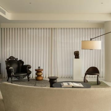 紗簾低垂,如半透的宣紙,成了光的畫布。建筑的飛檐斜斜切過簾幕,光影時(shí)深時(shí)淺,墨色暈染又收束。院中的樹影也悄然攀上,枝椏疏淡,偶有風(fēng)過,便簌簌地晃成一片水墨的皴筆。幾何的純粹線條、東方的朦朧詩韻,共同剝離掉所有雜音,室內(nèi)寧靜,因這一簾浮動(dòng)的影而生動(dòng)起來。